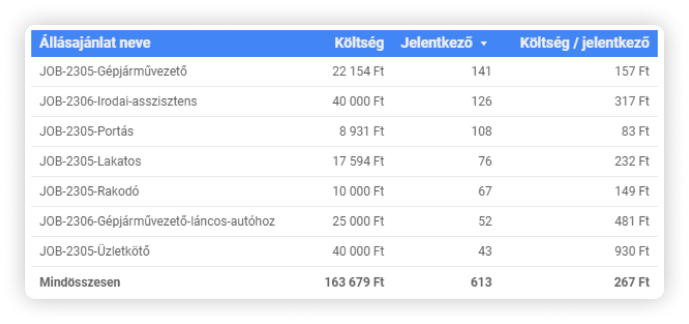 A legtöbb álláshirdetésre 600-800 Ft/jelentkező áron toboroztunk.